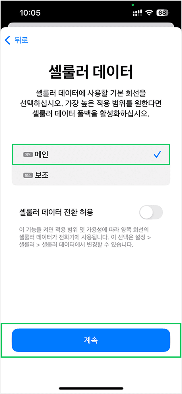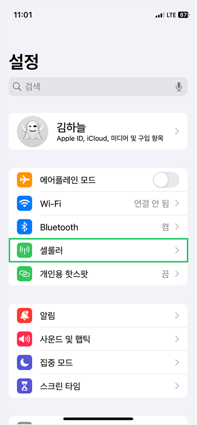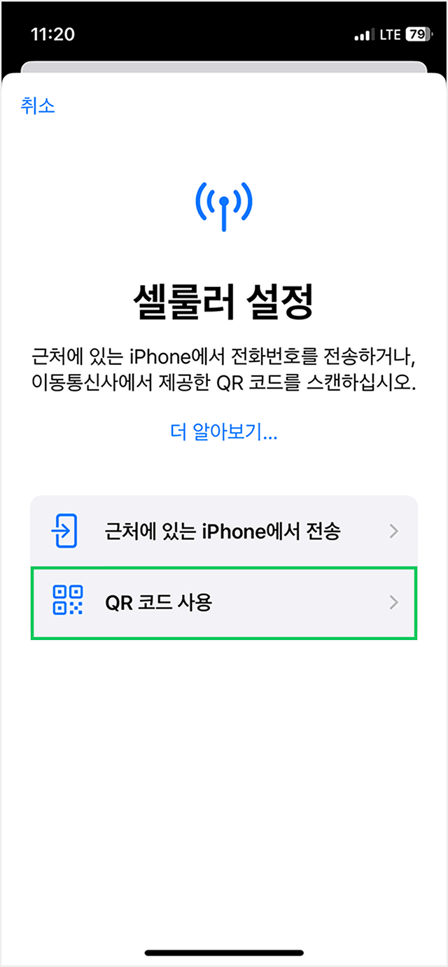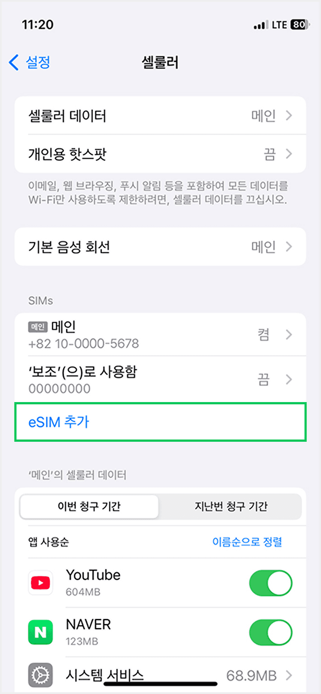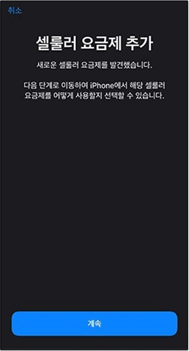 [설정] > ‘셀룰러’에서 ‘eSIM 추가’ 또는 ‘요금제 추가‘ 메뉴를 선택해 주세요